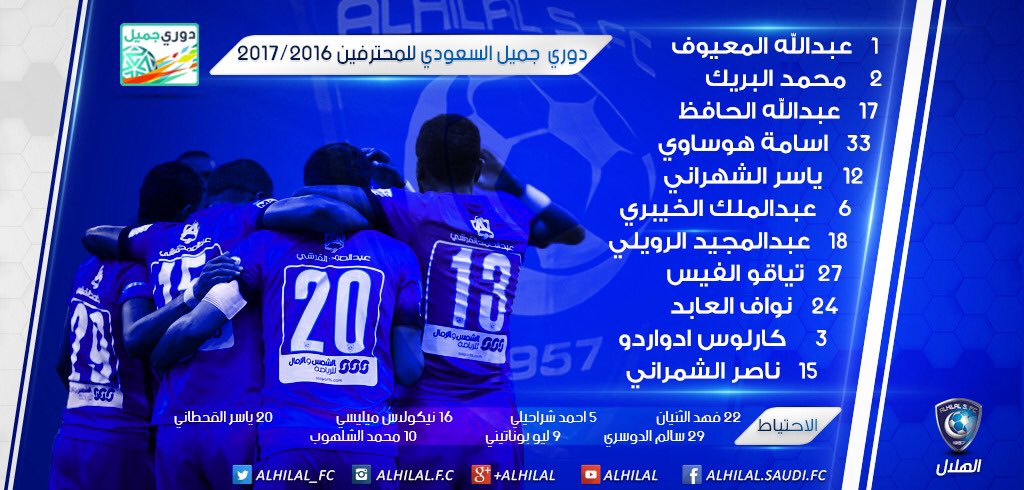 وجاءت تشكيلة الهلال الأساسية، كالتالي؛ المعيوف – الحافظ – هوساوي – البريك – الشهراني – الخيبري – الرويلي – تياغو ألفيش – العابد – إدواردو – ناصر الشمراني.