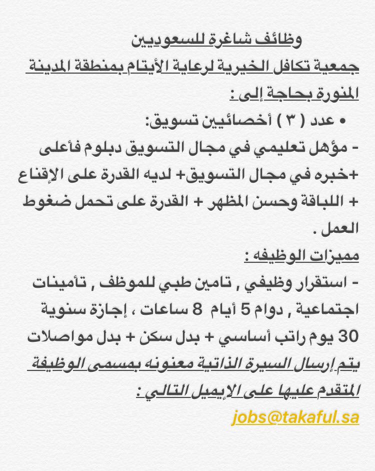 أعلنت جمعية تكافل الخيرية لرعاية الأيتام، بمنطقة المدينة المنورة، توفّر عدد (3) وظائف شاغرة للسعوديين، بمسمى “أخصائيي تسويق”؛ وذلك وفق الشروط التالية: