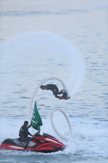 بعد ذلك ألقيت قصيدة للشاعر سلطان الرويلي , بعد ذلك لوحتين وطنيتين بأوبريت “أبحر شمالا” ,كلمات الشاعر عبدالمجيد الشمري , وأداء الطفلة نفن نايف ثم استعراض عدد من المتسابقين بالدبابات البحرية أمام الجمهور , قدموا فيها مغامرات الماء , ثم عرض للفلاي بورد .