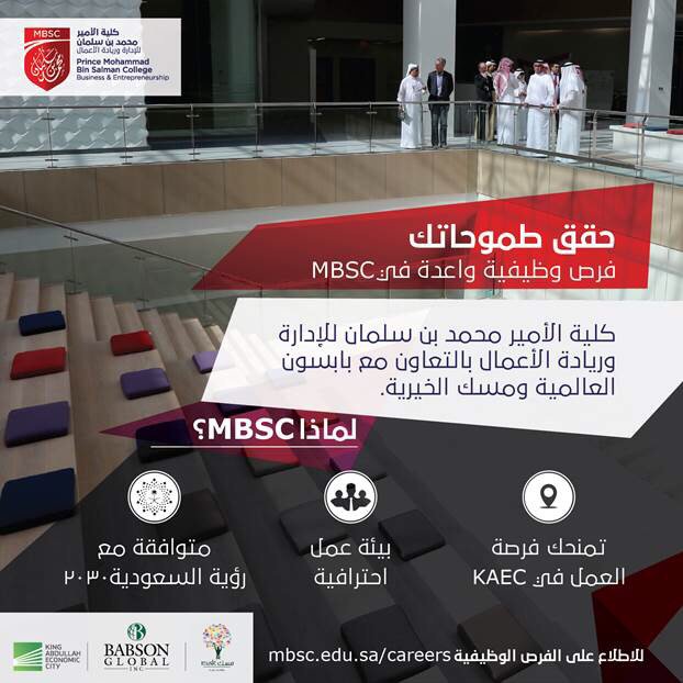 أعلنت كلية الأمير محمد بن سلمان للإدارة وريادة الأعمال “MBSC” – عبر موقعها الإلكتروني، بالتعاون مع بابسون العالمية ومسك الخيرية، عن توافر فرص وظيفية واعدة بمجالات مختلفة، بمسمى “مسجل كلية – مساعد مدير التسويق والاتصالات – مدير التطوير المهني – موظف التوظيف للطلاب – مساعد إداري – منسق قسم الأكاديمية – مدير المالية – مساعد تنفيذي – محلل بيانات القبول والتسجيل – مدير الأحداث”.