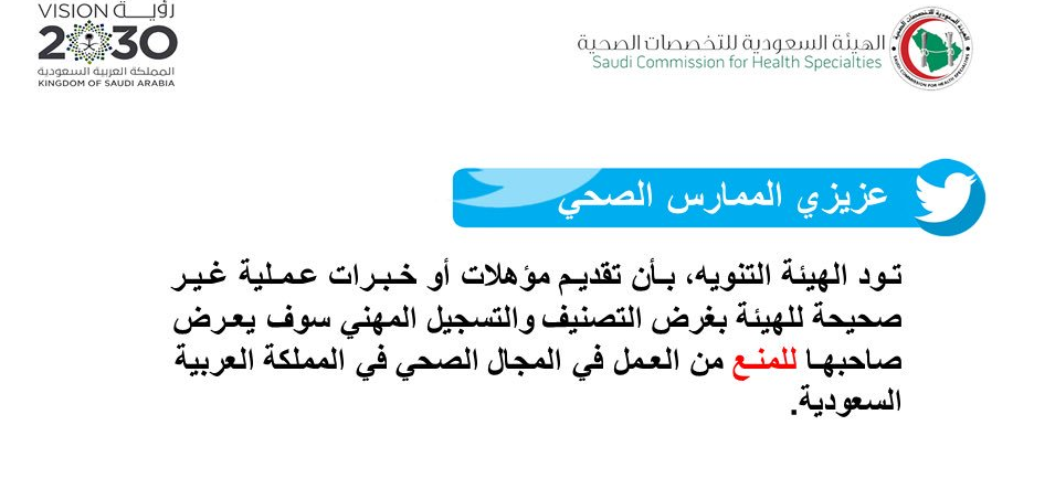 وأكدت الهيئة في تغريدة لها عبر حسابها الرسمي بموقع التواصل الاجتماعي “تويتر”: “تود الهيئة التنويه بأن تقديم مؤهلات أو خبرات عملية غير صحيحة بغرض التنصيف والتسجيل المهني سوف يعرض صاحبها للمنع من العمل في المجال الصحي في المملكة العربية السعودية”.