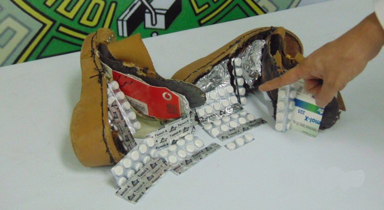 وتفصيلًا قال الأستاذ يوسف الزاكان، مدير عام جمرك مطار الملك فهد: “أثناء قيام المراقب الجمركي بتفتيش أمتعة أحد الركاب لوحظ وجود أجسام غريبة داخل تجويف فردتي حذاء بطبقة سحرية، وبعد إزالة الطبقة الجلدية بقاعدة الحذاء تبين أنها تحتوي على اثني عشر شريطًا، كل شريط يحتوي على عشر حبات وحبة واحدة فقط بيضاء اللون تحمل اسم “ترامادول” ليصبح العدد الإجمالي (121) مائة وواحد وعشرين حبة”.