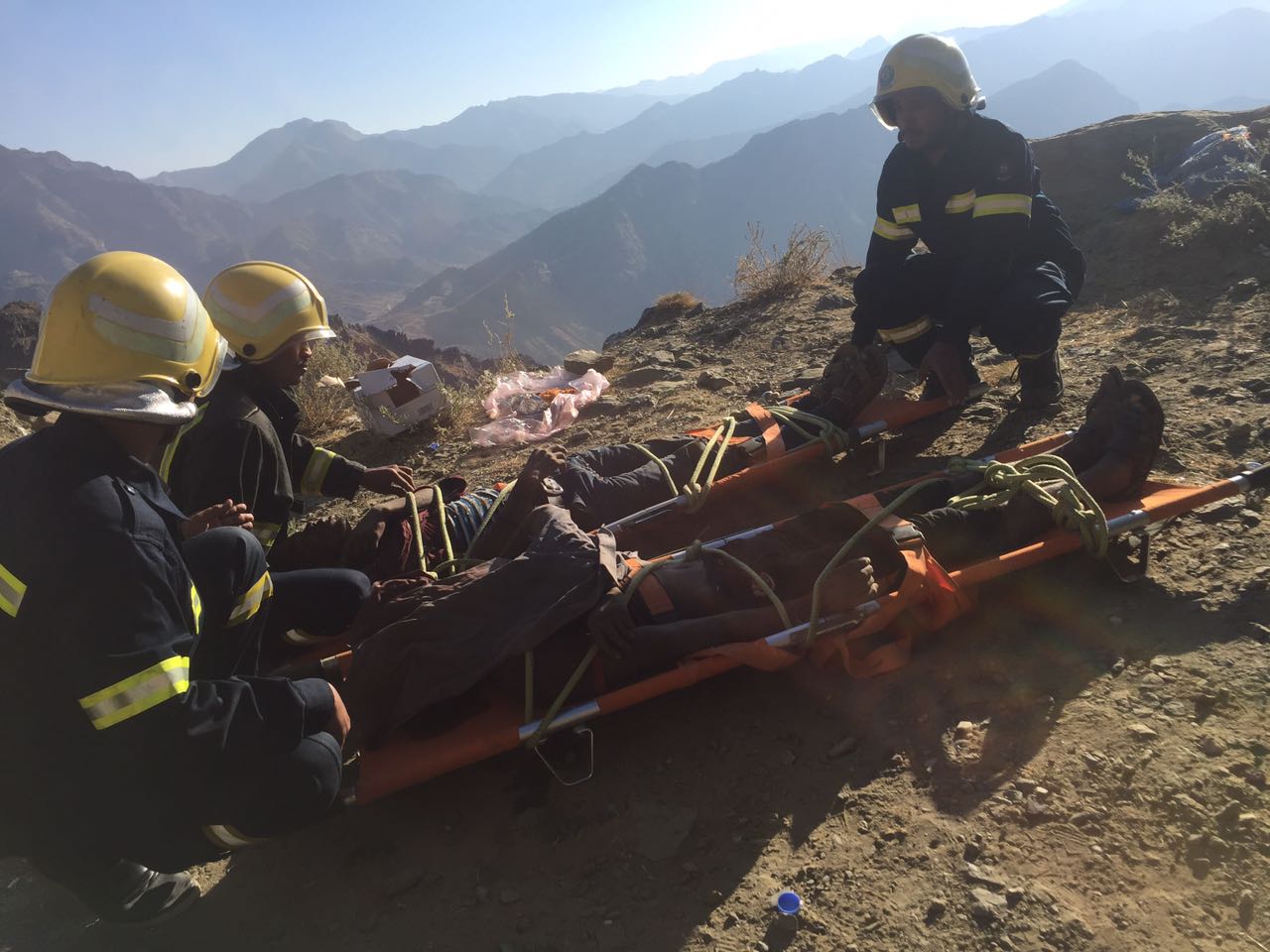 انتشل أفراد الدفاع المدني بالتعاون مع رجال حرس الحدود جثتي شخصين من الجنسية الإفريقية سقطا من مرتفع الصماء الجبلي بالداير، على بعد ٣٠٠ متر من موقع السقوط، بعد تطبيق عملية الإنقاذ الجبلي.
