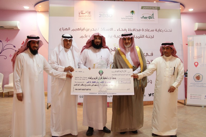 كما أعلن رئيس اللجنة، منور الشيحي، عبر كلمته في الحفل، تبرع اللجنة بعدد 100 سهم في وقف الوالدين التابع لجمعية كرام لتحفيظ القرآن الكريم، مقسمه على “20 سهماً عن القائم بأعمال محافظ محافظة رفحاء ووالديه، و20 سهماً عن مدير مركز التنمية بعرعر ووالديه، و20 سهماً عن وقف الشيخين سعد وعبدالعزيز الموسى، و40 سهماً عن مدربي ومتدربي الملتقى”.