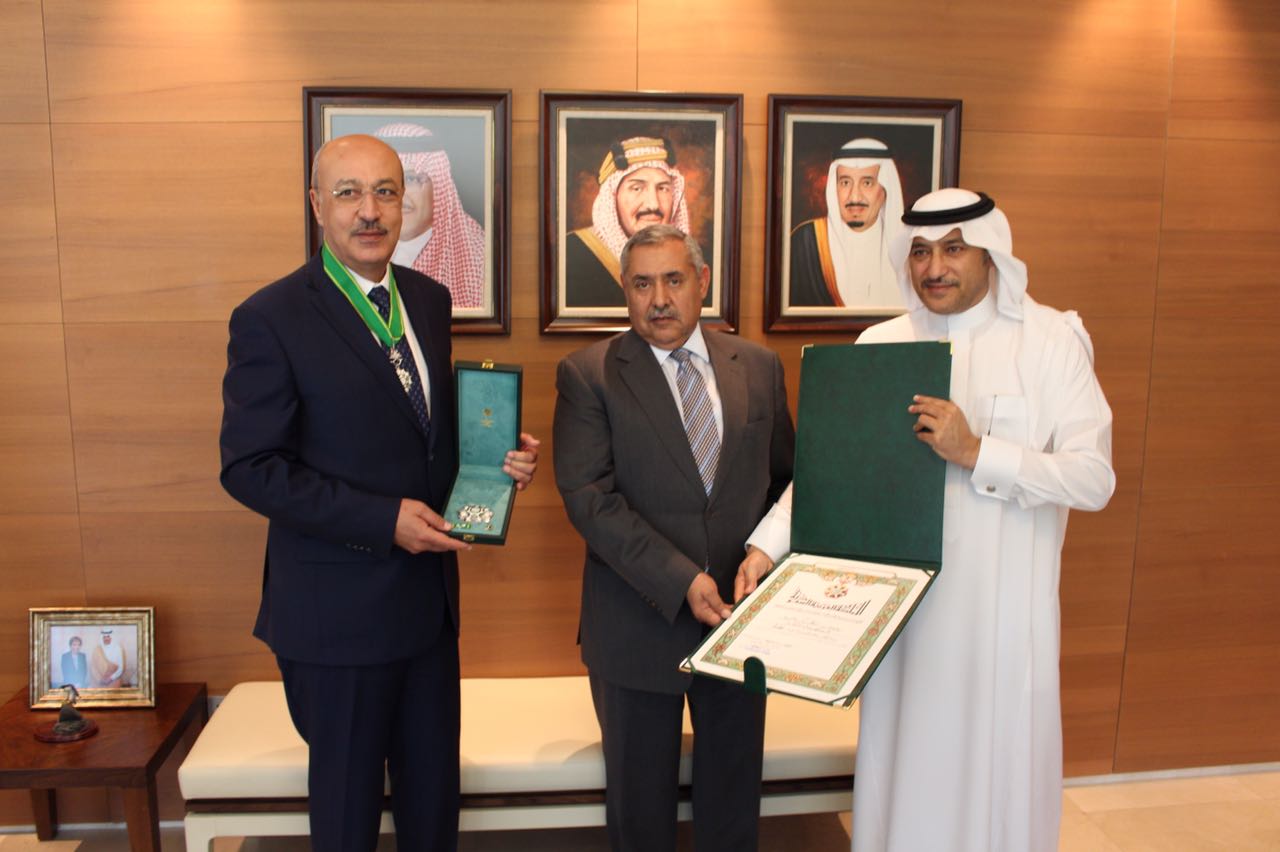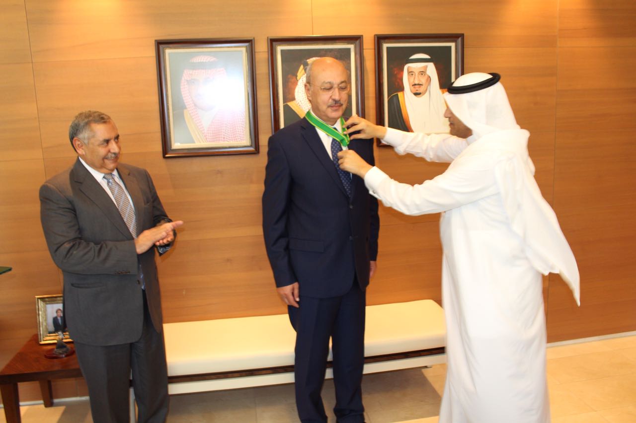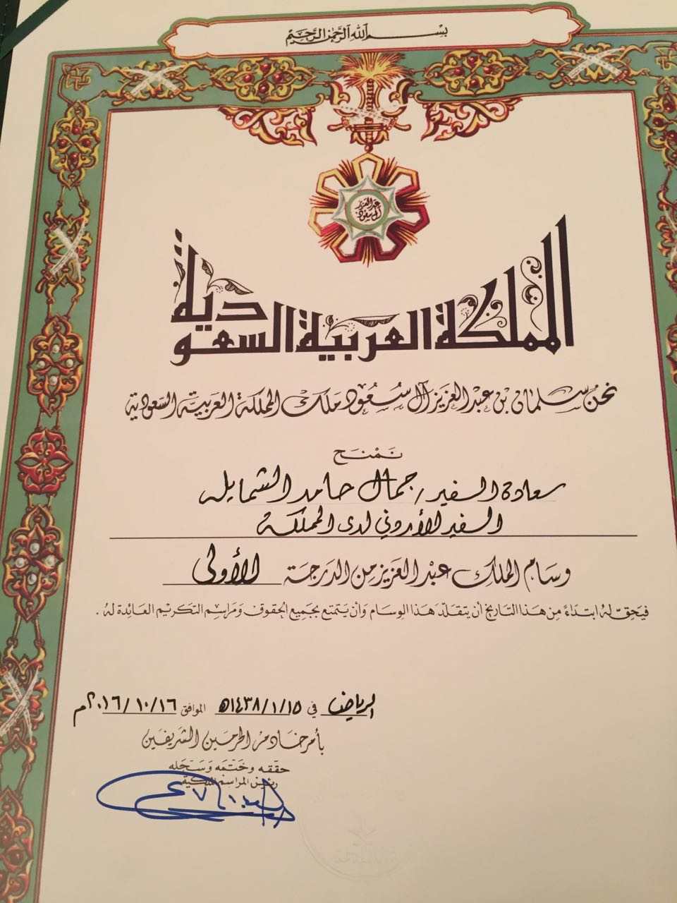 بتوجيه من خادم الحرمين الشريفين الملك سلمان بن عبد العزيز آل سعود -حفظه الله- قلّد صاحب السمو الأمير خالد بن فيصل بن تركي بن عبد الله آل سعود، سفير المملكة العربية السعودية لدى المملكة الأردنية الهاشمية، اليوم الثلاثاء، السفير الأردني السابق لدى السعودية السيد جمال الشمايلة، وسام الملك عبد العزيز من الدرجة الأولى، تكريمًا من خادم الحرمين الشريفين لجلالة الملك عبد الله الثاني بن الحسين وحكومة المملكة الأردنية الهاشمية، وتكريمًا للسفير الشمايلة بمناسبة انتهاء مهام عمله في الرياض. وقام سمو السفير بتقليد الشمايلة الوسام وسط مراسم رفيعة المستوى، جرت بحضور أمين عام أمين عام وزارة الخارجية وشؤون المغتربين الأردني بالوكالة السفير نايف الزيدان، مندوبًا عن نائب رئيس الوزراء ووزير الخارجية وشؤون المغتربين الأردني ناصر جودة.