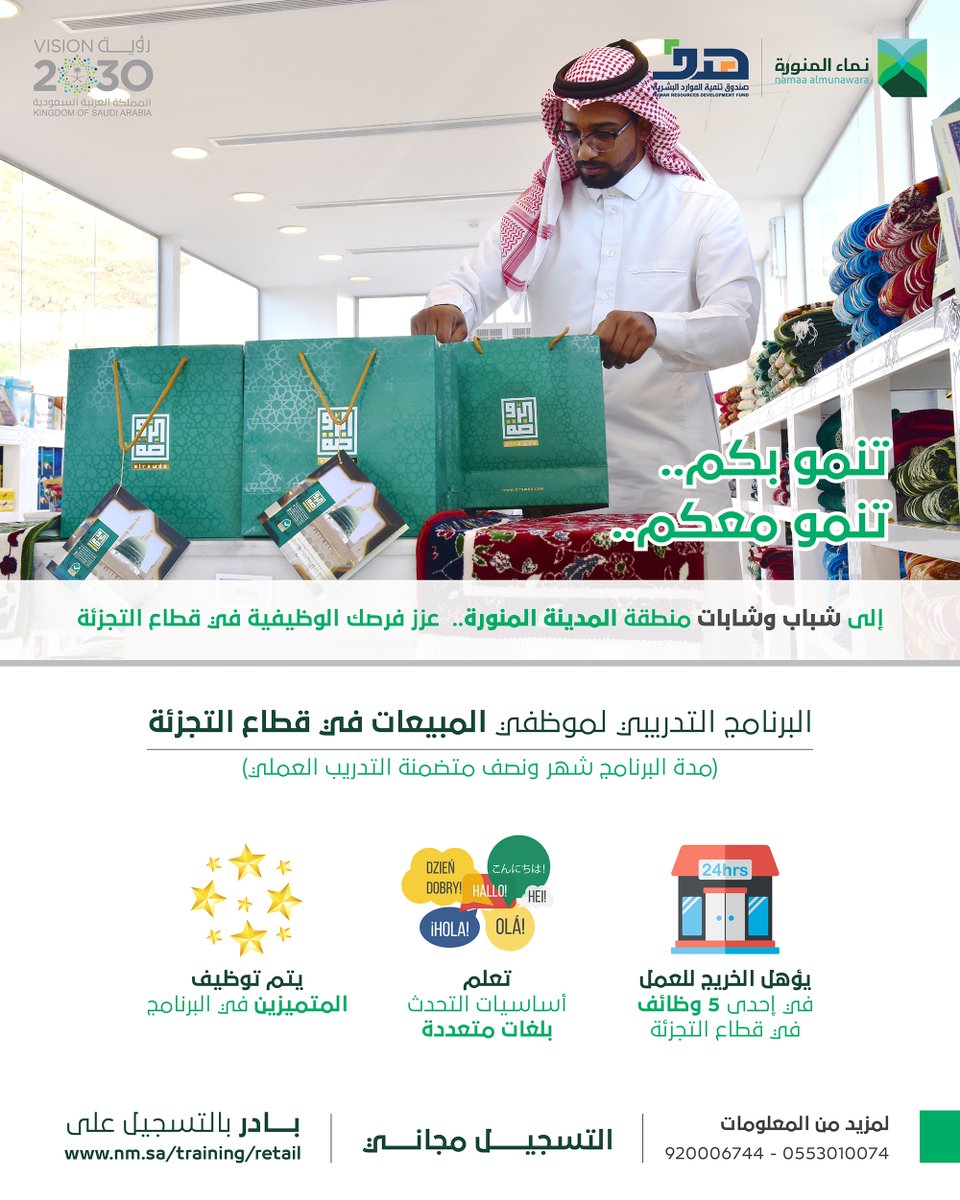 أعلنت مؤسسة نماء المنورة، عن فتح باب التسجيل بالبرنامج التدريبي المنتهي بالتوظيف “موظفي المبيعات في متاجر التجزئة”، لشباب وشابات منطقة المدينة المنورة ممن يرغبون بالعمل بوظيفة “بائع” في قطاع التجزئة في متاجر “صنع المدينة” ولدى شركاء نماء المنورة للمتميزين من خريجي البرنامج.