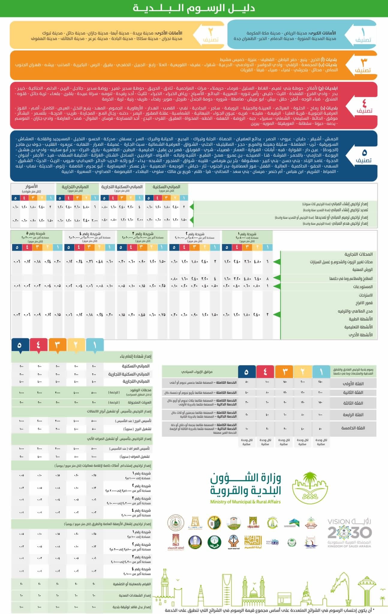 وأوضحت وزارة الشؤون البلدية والقروية، أن الرسوم البلدية الجديدة، تم إقرارها على ضوء دراسات، حيث راعت التدرج المكاني بحسب المدن والمحافظات والمراكز، آخذه بعين الاعتبار الاستراتيجية العمرانية والنشاط الاقتصادي؛ حيث تم تصنيف أمانات وبلديات المملكة إلى خمسة تصنيفات؛ على النحو التالي: التصنيف الأول – الأمانات الكبرى؛ وتضم: 1) أمانة منطقة الرياض (مدينة الرياض)، 2)أمانة العاصمة المقدسة (مدينة مكة المكرمة)، 3) أمانة منطقة المدينة المنورة (مدينة المدينة المنورة)، 4) أمانة المنطقة الشرقية (مدينة الدمام، الخبر، الظهران)، 5) أمانة محافظة جدة (مدينة جدة).