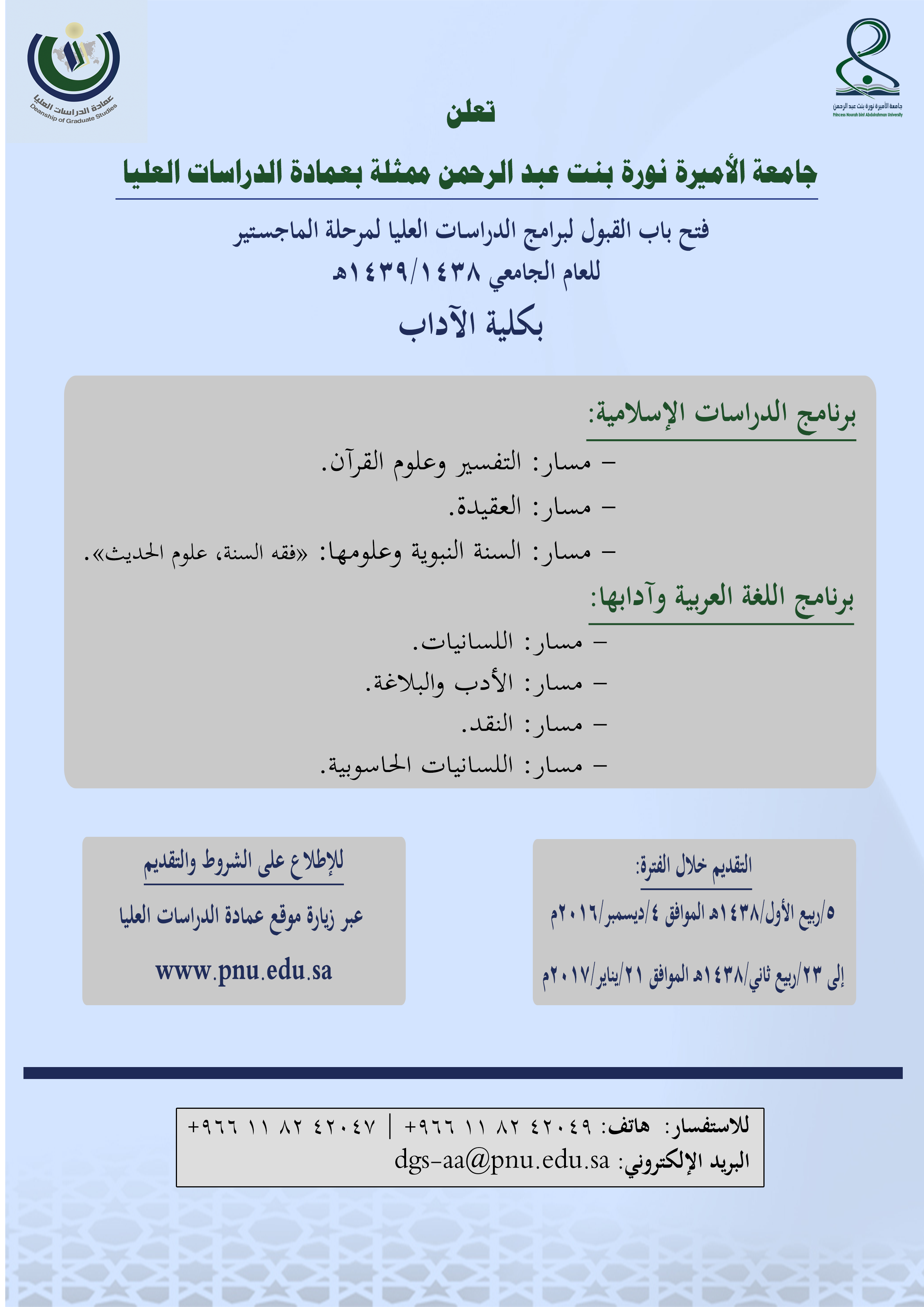 أعلنت جامعة الأميرة نورة بنت عبدالرحمن ممثلة بعمادة الدراسات العليا، عن فتح باب القبول لبرنامج الدراسات العليا لمرحلة الماجستير للعام الجامعي 1438/ 1439هـ، بكلية الآداب، وفق مسارات البرامج التالية: