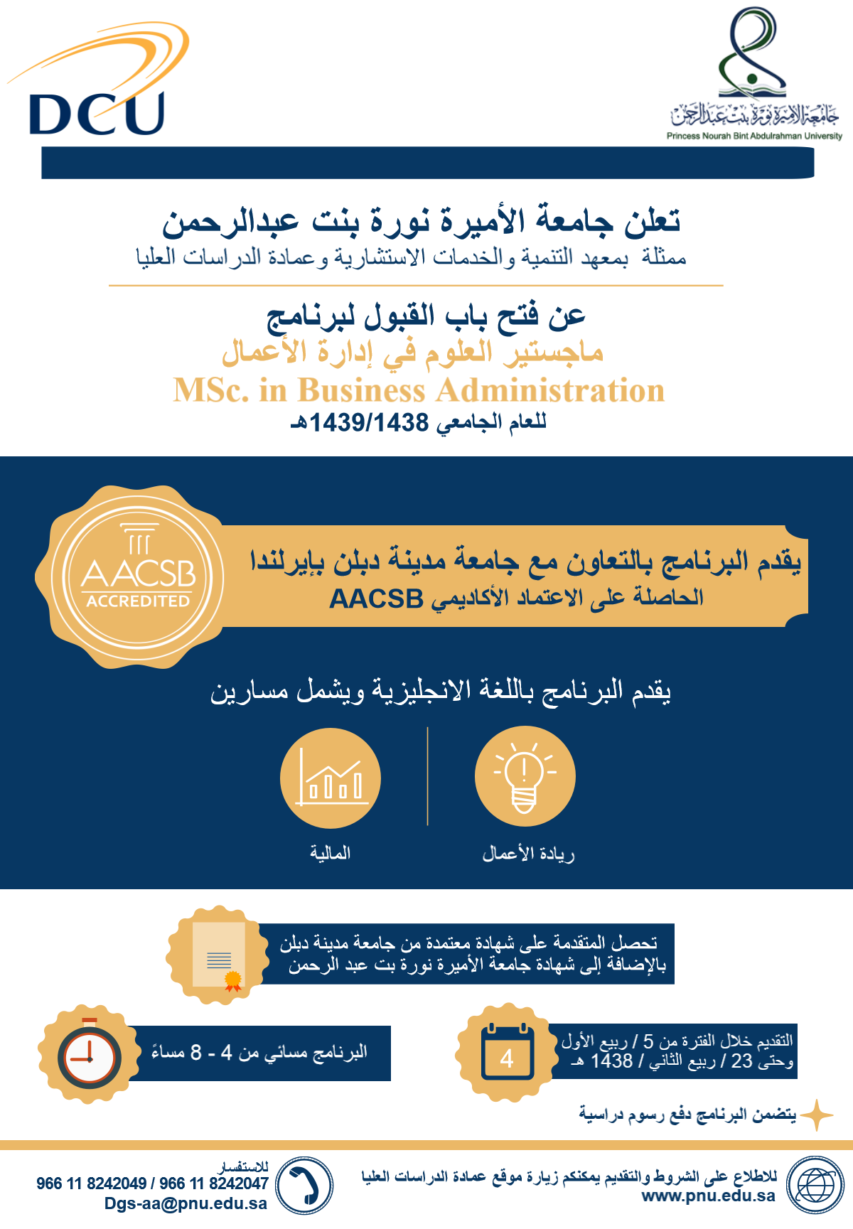 كما أعلنت جامعة الأميرة نورة بنت عبدالرحمن ممثلة بمعهد التنمية والخدمات الاستشارية وعمادة الدراسات العليا، عن فتح باب القبول لبرنامج ماجستير العلوم في إدارة الأعمال، للعام الجامعي 1438/ 1439هـ، وبالتعاون مع جامعة مدينة دبلن بإيرلندا.