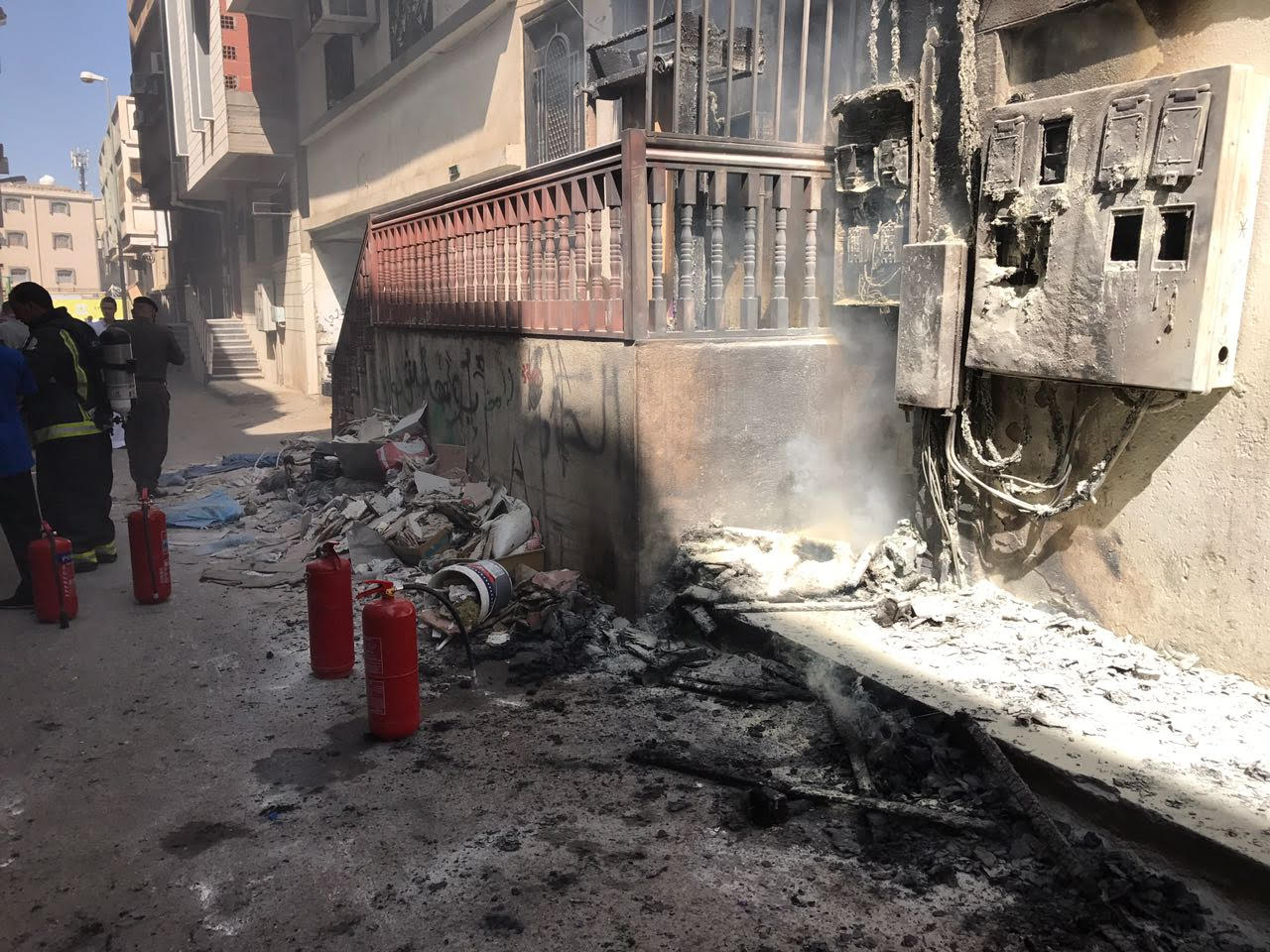 و أضاف أنه تم نقل الفرق اللازمة للموقع وعند الوصول تبين أن الحادث في (6) عدادات  وتم إخماد الحريق من قبل الدفاع المدني بواسطة المطفيات اليدوية، فيما تم إخلاء السكان إلى سطح  المنزل إحترازيًا دون وقوع إصابات، كما تم تسليم الموقع لمندوب شركة الكهرباء.