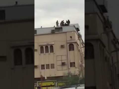 وبيّن فيديو متداول لحظة إنقاذ الوافد، حيث تفاوض معه أحد رجال الدفاع المدني وهو يقف أمامه على سطح المبنى،ولم يلبث أن نجح ومعه آخرين من منعه.