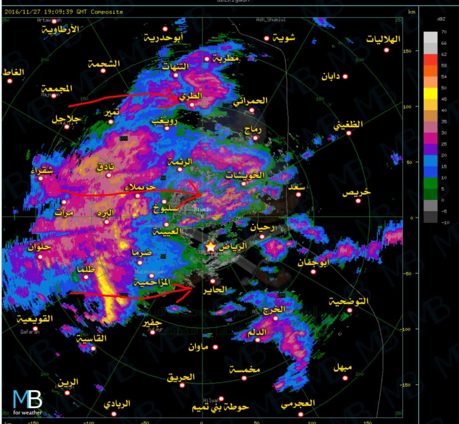توقع أستاذ المناخ المشارك بقسم الجغرافيا بجامعة القصيم الدكتور عبدالله المسند وجود تشكيلات سحب ماطرة خلال ساعة من الآن على منطقة الرياض تشمل محافظة الخرج والمحمل.