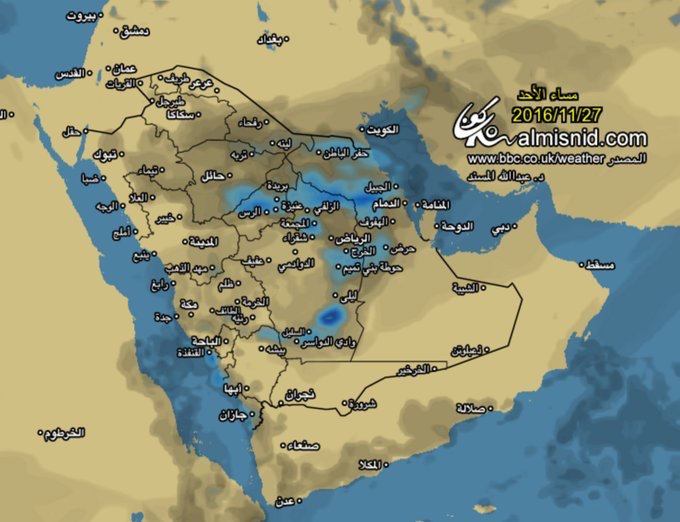 وقال المسند عبر حسابه على موقع التواصل الاجتماعي ” تويتر ” : تنبيه!! من المتوقع أن تبلغ الرياض و الخرج و المحمل سحب ماطرة خلال ساعة من الآن أو أقل والله أعلم”.