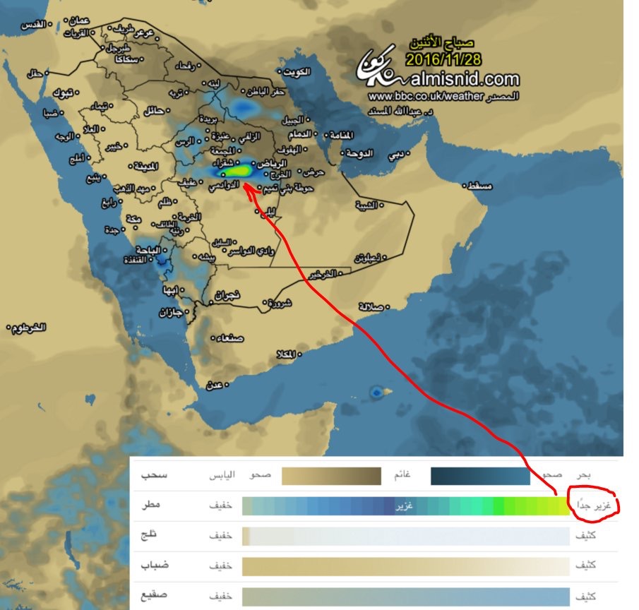 ونوه المسند إلى أن “التوقعات المطرية ليوم غد الاثنين أن الأمطار قد تكون قوية في مثلث الرياض شقراء الدوادمي والله أعلم”.