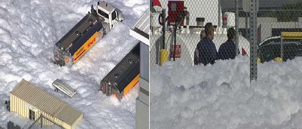 ملأ كم هائل من الرغاوي حظيرة طائرات في مطار سان خوسيه الدولي في سانتا كلارا، بكاليفورنيا قبل أن تتدفق إلى الشوارع القريبة.