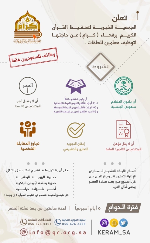أعلنت الجمعية الخيرية لتحفيظ القرآن الكريم برفحاء “كرام” عن حاجتها لتوظيف معلمين سعوديين في الحلقات، للعمل خمسة أيام أسبوعياً لمدة ساعتين من بعد صلاة العصر، وفق الشروط التالية: