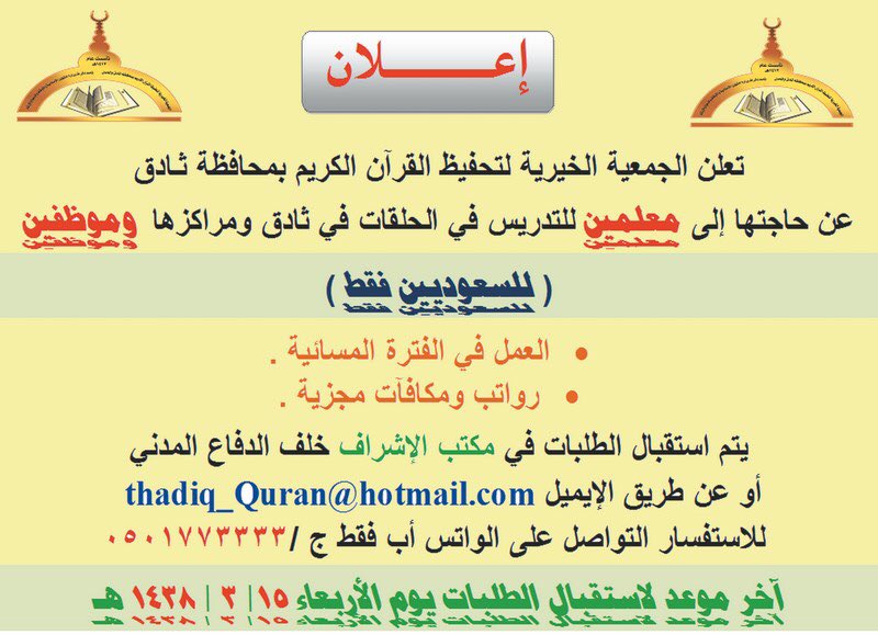 أعلنت الجمعيّة الخيريّة لتحفيظ القرآن الكريم بمحافظة ثادق عن حاجتها إلى موظّفين ومعلّمين للتدريس في الحلقات في ثادق ومراكزها، للعمل في الفترة المسائيّة، وبرواتب ومكافآت مجزية.