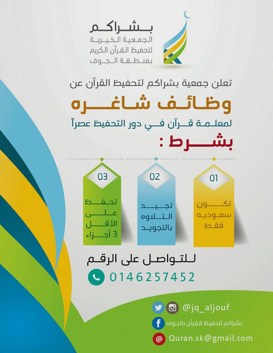 أعلنت الجمعية الخيريّة لتحفيظ القرآن الكريم “بشراكم” بمنطقة الجوف عن توافر وظائف شاغرة بمسمّى “معلّمات قرآن”، للعمل في دور التحفيظ عصرًا، حسب الشروط التالية:
