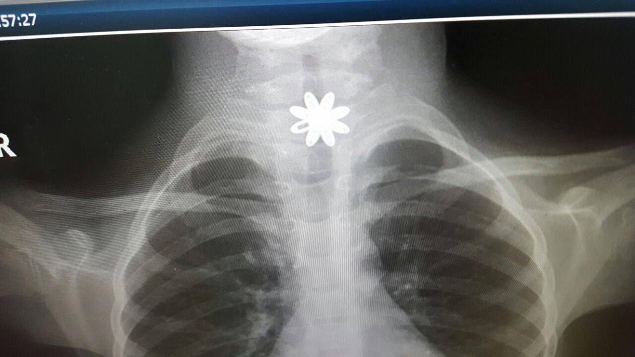 كانت الطفلة قد أُدخِلت المستشفى وهي تعاني انسدادًا في المريء، وبعد تشخيص الحالة، اتّضح وجود قطعة معدنية حادة تشكِّل خطورةً على حياة الطفلة، ممّا أدّى إلى جروحٍ قطعية داخل المريء.