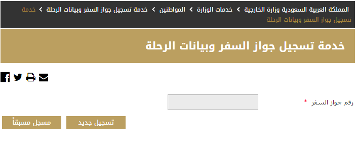 *خدمة تسجيل جواز السفر وبيانات الرحلة متاحة فقط للمواطنين السعوديين الموجودين خارج المملكة يجب على المواطن تعبئة نموذج تسجيل الجواز الإلكتروني مباشرة من خلال موقع وزارة الخارجية .