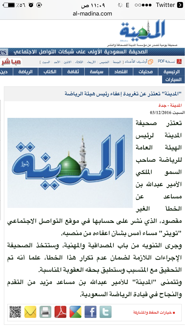 وجاء نص اعتذار صحيفة المدينة :”تعتذر صحيفة المدينة لرئيس الهيئة العامة للرياضة صاحب السمو الملكي الأمير عبدالله بن مساعد عن الخطأ الغير مقصود، الذي نشر على حسابها في موقع التواصل الاجتماعي “تويتر” مساء أمس بشأن إعفائه من منصبه“.