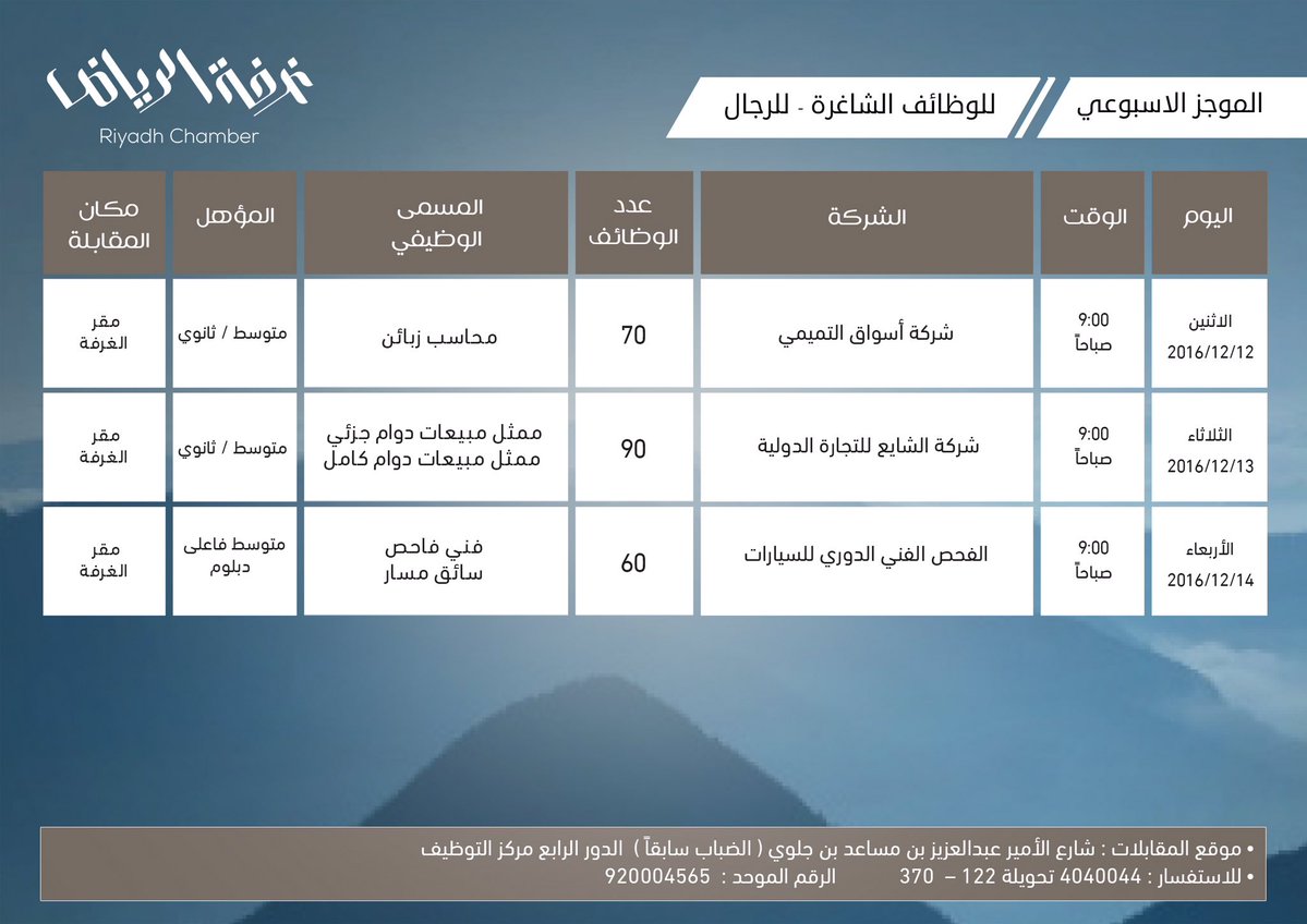 وأوضحت الغرفة، أنه سيتم إجراء المقابلات بمقر مركز التوظيف بالغرفة، وذلك ابتداءً من يوم الإثنين الموافق 12/ 12/ 2016 م، ولمدة ثلاثة أيام، عند الساعة التاسعة صباحًا.