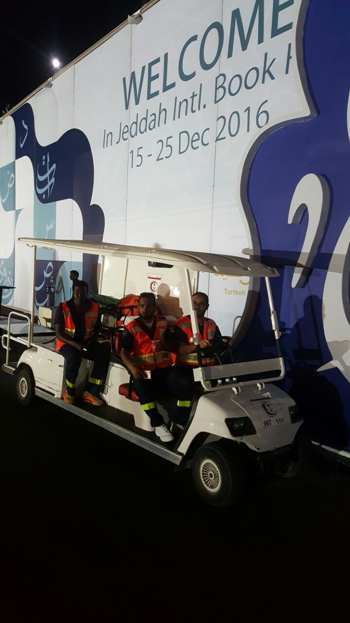 صرح المتحدث الرسمي لهيئة الهلال الأحمر بمحافظة جدة عبدالله أبو زيد بأن فرق هيئة الهلال الأحمر السعودي ، والفرق الراجلة المتواجدة في مسارات معرض جدة للكتاب 2016 ، والساحات الخارجية للمعرض باشرت من يوم الخميس إلى يوم السبت ثماني حالات إسعافية.