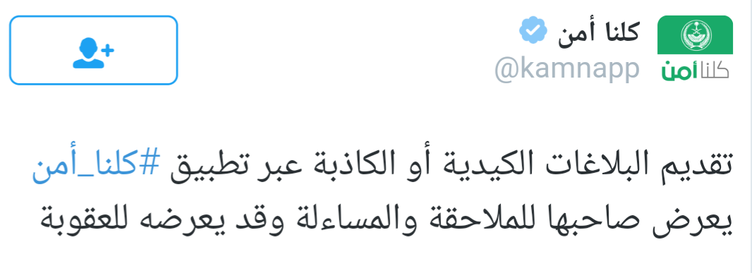 وأكد حساب “كلنا أمن” أن تقديم البلاغات الكيدية أو الكاذبة، عبر تطبيق “كلنا أمن” يعرض صاحبها للملاحقة والمساءلة وقد يعرضه للعقوبة.