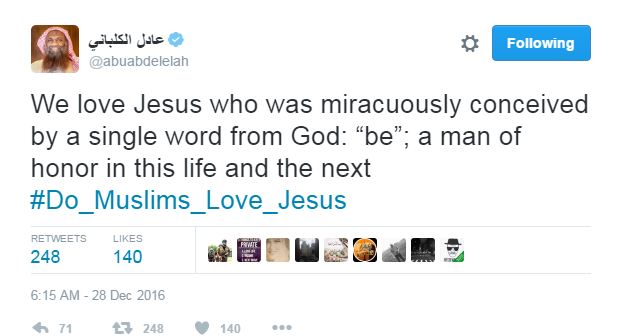 وكتب الكلباني : “We love Jesus who was miracuously conceived by a single word from God: “be”; a man of honor in this life and the next ”