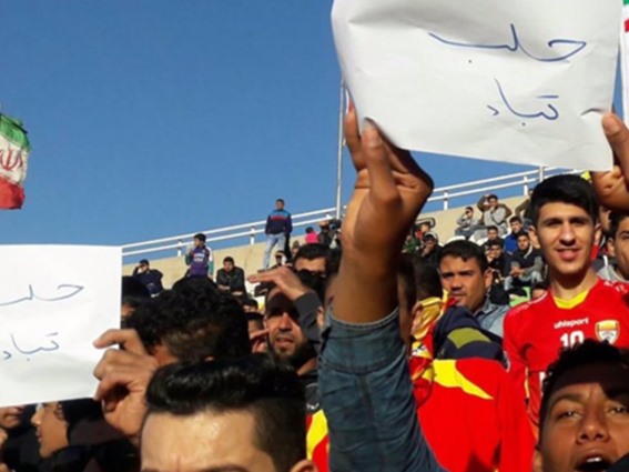 هتف مشجعون خلال مباراة لكرة القدم في مدينة الأحواز ، مساء أمس الجمعة، ضد المجازر التي ترتكب في حلب، وتظاهروا ضد رئيس النظام السوري بشار الأسد.