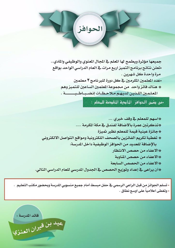 وتم وضع العديد من الحوافز في المجال المعنوي والمادي والوظيفي التي يطمح وينافس عليها العديد من المعلمين.
