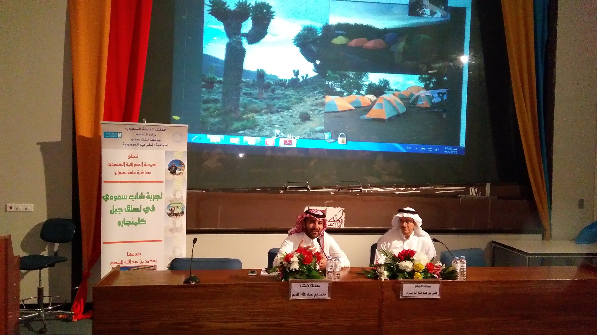 استضافت الجمعية الجغرافية السعودية ، بجامعة الملك سعود ،مؤخراً، الكشاف محمد بن عبدالله الملحم ، للحديث عن تجربته المثيرة بالصعود لأعلى رابع قمة جبلية بالعالم في جبال كلمنجارو، شمال شرق دولة تنزانيا والتي يبلغ ارتفاعها 5895 متراً.