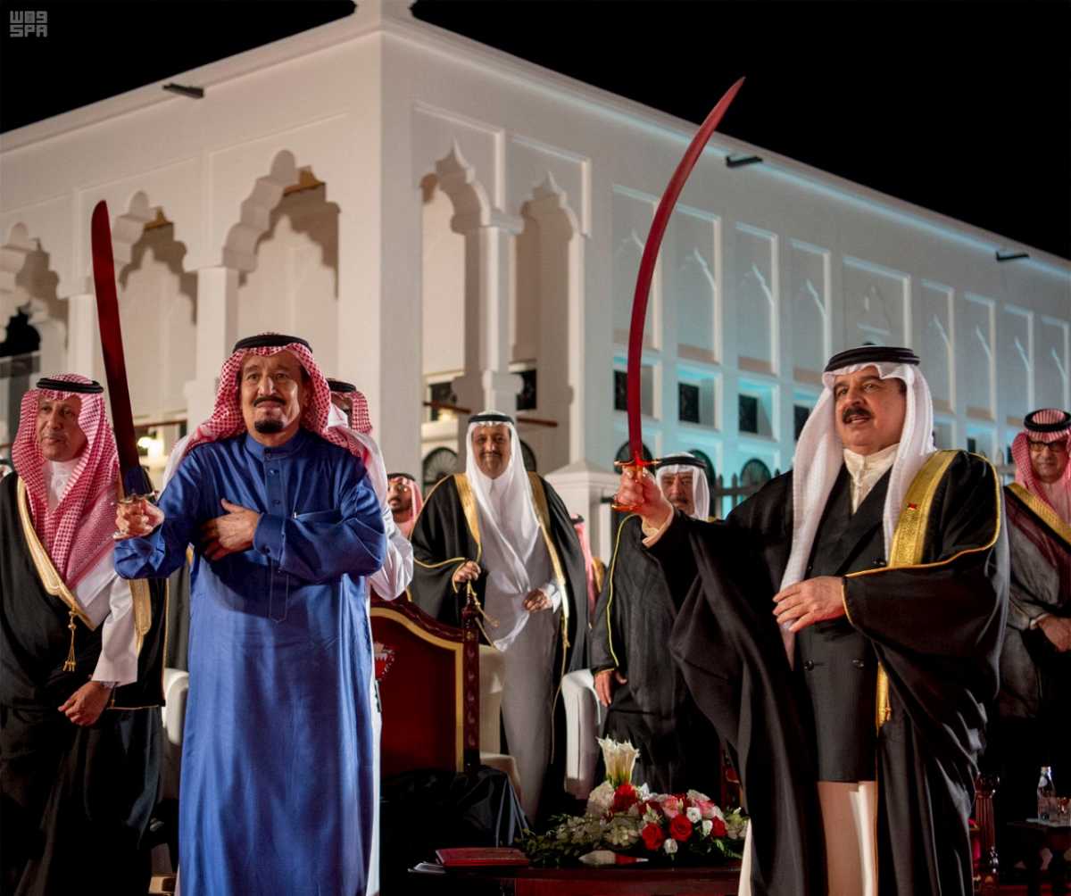 وكانت البحرين ملكاً وشعباً احتفت مساء أمس بخادم الحرمين في حفل أقيم بقصر الصخير , حيث أُجريت للملك مراسم استقبال رسمية؛ إذ عُزف السلامان الملكيان للبلدَيْن.