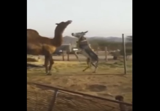 شاهد.. أشرس معركة بين حمار وجمل موثق القدمين