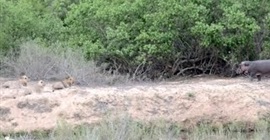 شاهد.. فرس نهر يطارد 3 أسود حاولت إخافته