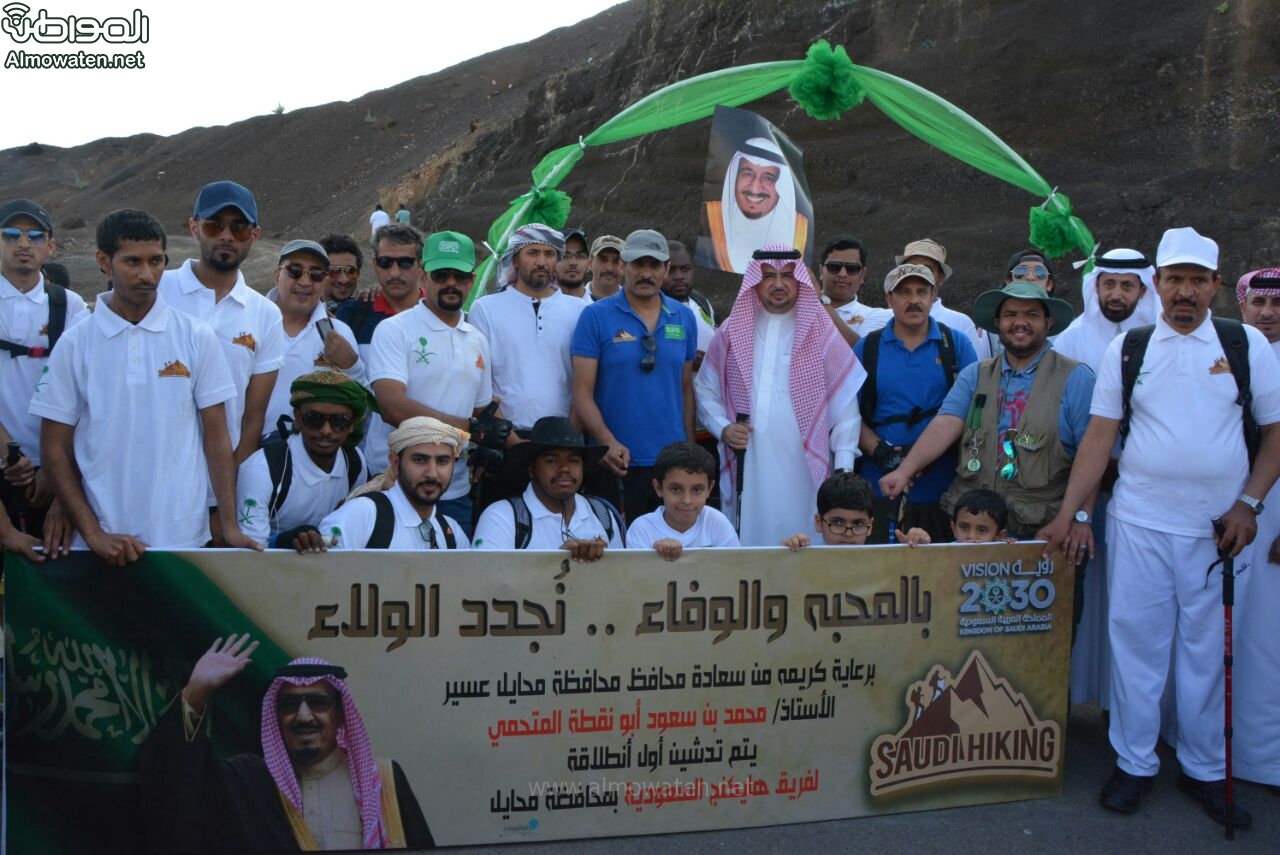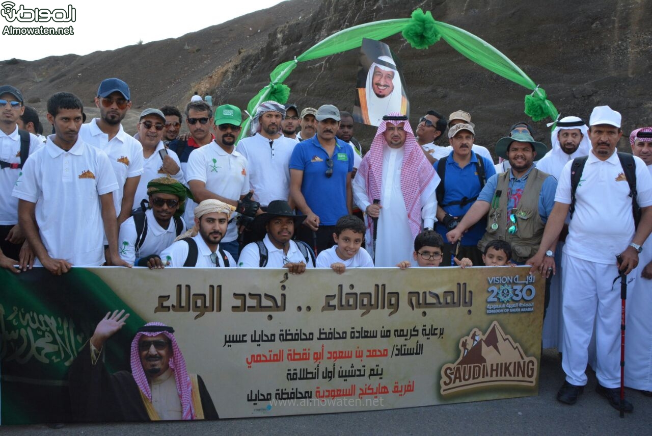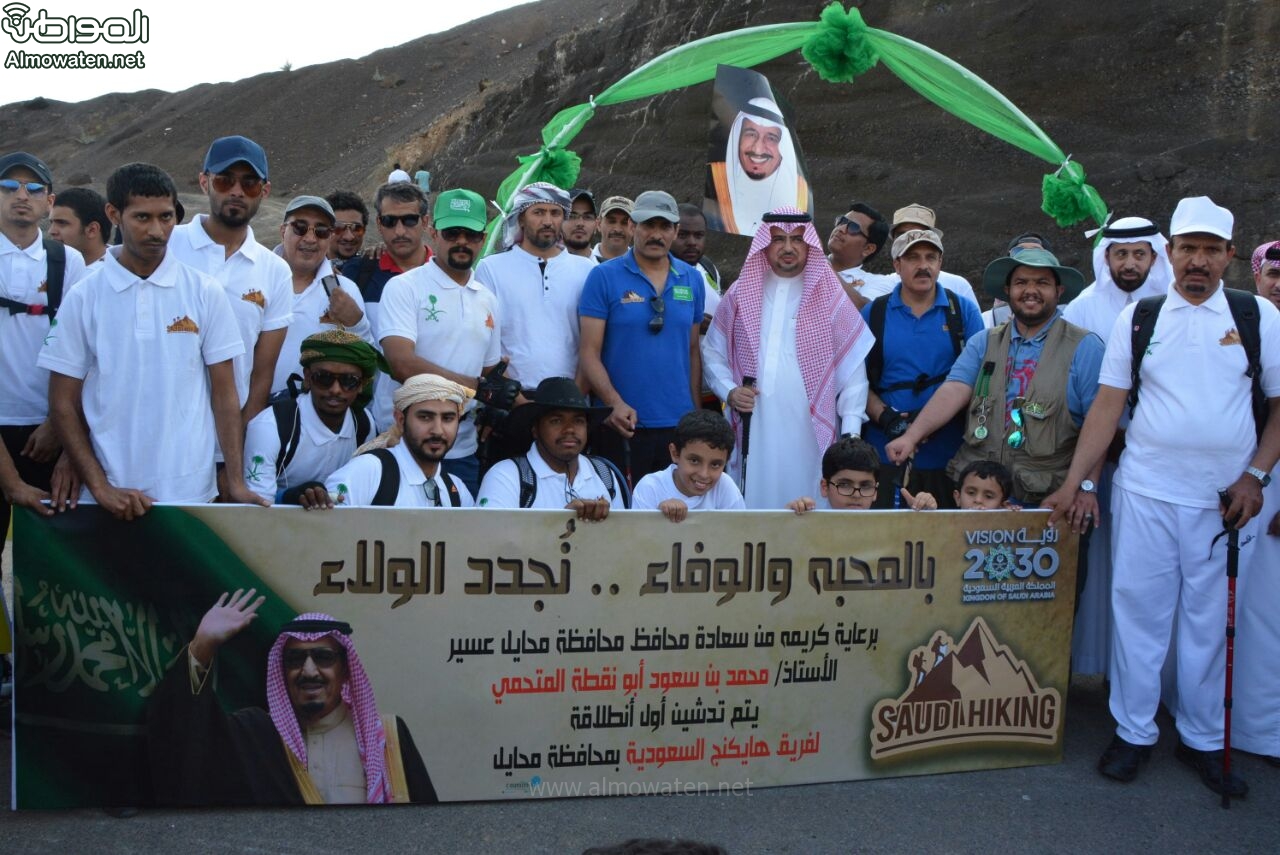 وبيّن الكابتن ”علي القحطاني“ مؤسس الفريق، أنّ هذه المشاركة التي خصّ بها محافظة محايل لهذه المرة؛ هي احتفاءً ببيعة مولاي خادم الحرمين الشريفين الملك سلمان بن عبد العزيز -حفظه الله ورعاه -، مشيرًا إلى أن الفعالية تنتهي في أعلى قمة جبل الحيلة وسيقوم الفريق حينها برفع علم المملكة العربية السعودية، احتفاءً بهذه البيعة المباركة، وتأكيدًا من الفريق المشارك باسم أبناء الوطن الغالي بأنهم جميعًا فداءٌ له، مشيرًا إلى أن هذه المشاركة بدعوة كريمة من محافظ محايل، الذي هيّأ لهم كل سبل في إنجاح هذه المشاركة.