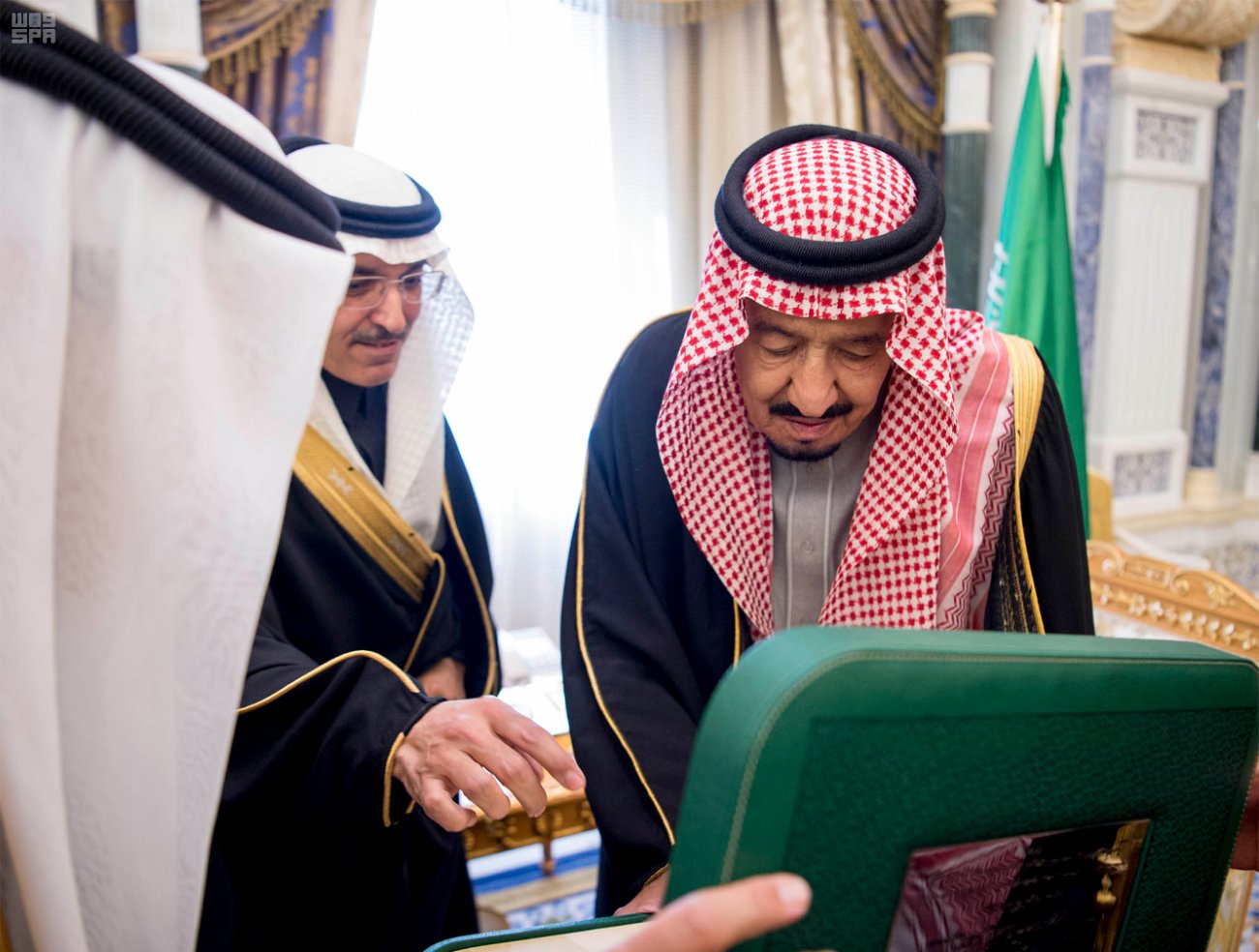 وقام بتسليم الإصدار لخادم الحرمين الشريفين، معالي وزير المالية الأستاذ محمد بن عبدالله الجدعان، ومعالي محافظ مؤسسة النقد العربي السعودي الدكتور أحمد بن عبدالكريم الخليفي، ومعالي نائب محافظ مؤسسة النقد العربي السعودي الأستاذ عبدالعزيز بن صالح الفريح، خلال استقبال الملك المفدى لهم اليوم في مكتبه بقصر اليمامة.