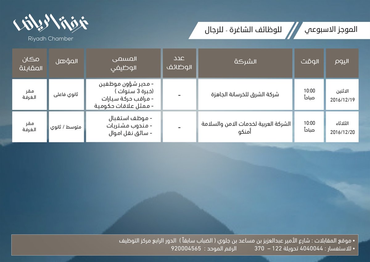 وأوضحت الغرفة، أنه سيتم إجراء المقابلات بمقر مركز التوظيف بالغرفة، وذلك ابتداءً من يوم الاثنين الموافق 19/ 12/ 2016م، ولمدة يومين، عند الساعة العاشرة صباحاً.