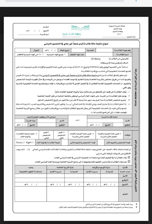 اعتمد وزير التعليم الدكتور أحمد العيسى نموذج الحاق الطلبة بطيئي التعلم ببرنامج متابعة حالة الطالب والطالبة الذين يبدون ضعفًا غير عادي في التحصيل الدراسي (بطيئي التعليم).