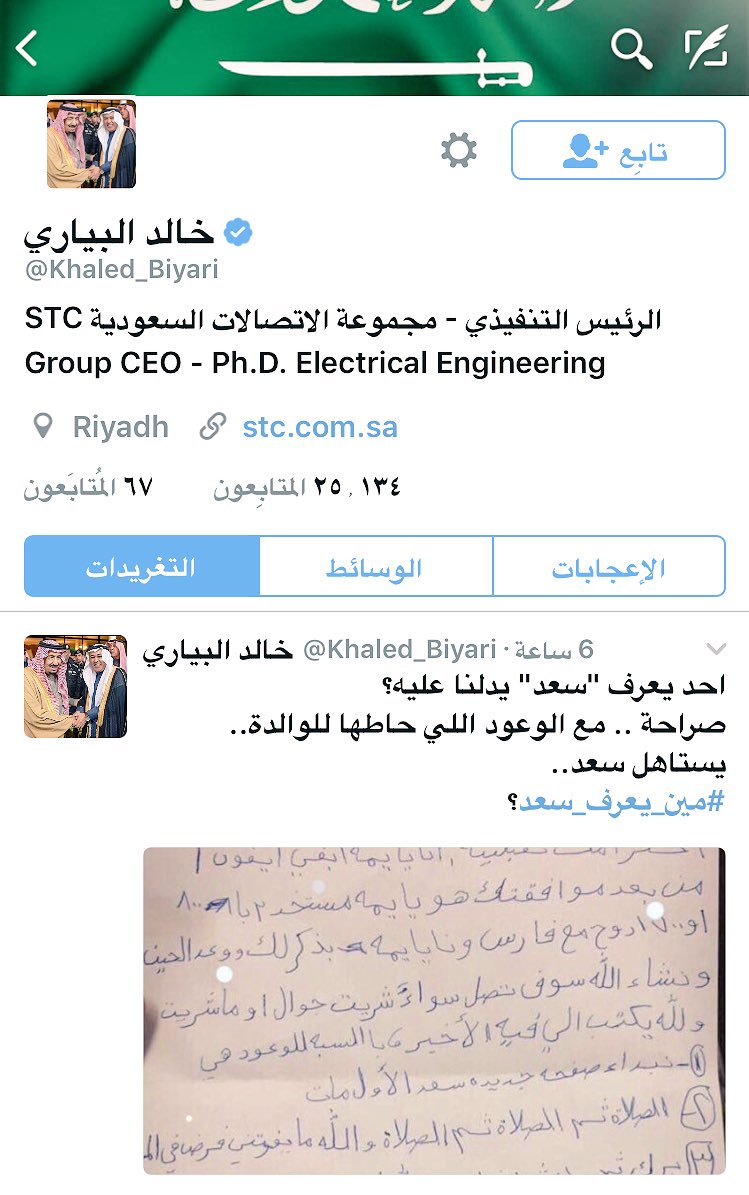 رسالة مصورة دونت عليها عبارة “يمة أبغى آيفون 6” تفاعل معها الرئيس التنفيذي لشركة الاتصالات السعودية خالد البياري ليقوم هو مباشرة بعد تداول تلك الرسالة على نطاق واسع عبر وسائل التواصل الاجتماعي بالرد قائلاً: “احد يعرف “سعد” يدلنا عليه؟ صراحة .. مع الوعود اللي حاطها للوالدة.. يستاهل سعد”.