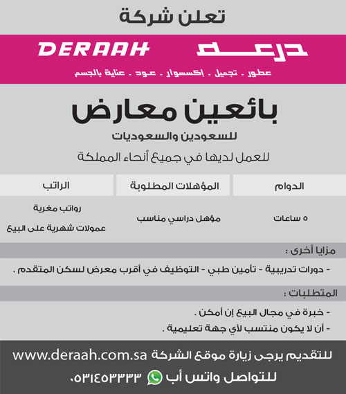 أعلنت شركة درعة عن توافر وظائف شاغرة للسعوديين والسعوديات بمسمى: “بائعين معارض”، وذلك للعمل بفروع الشركة في جميع أنحاء المملكة، ولمدة (5) ساعات.