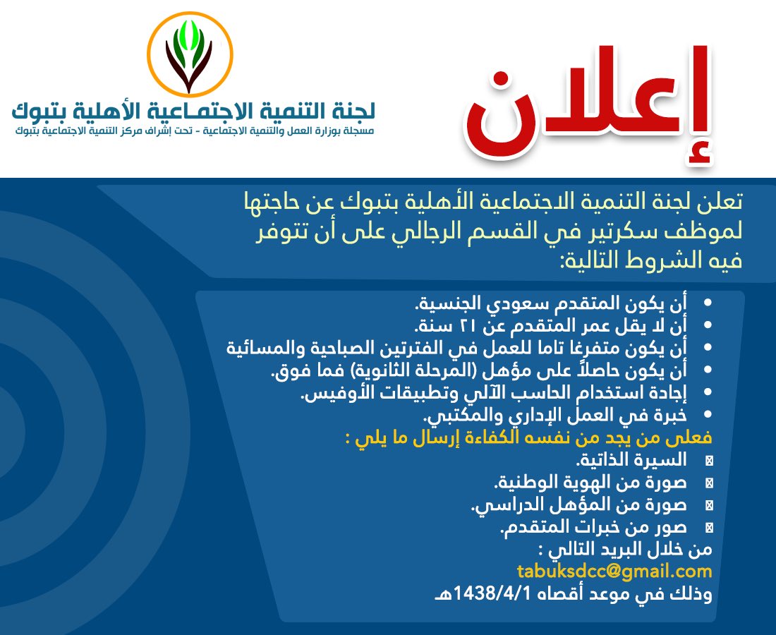 أعلنت لجنة التنمية الاجتماعية الأهلية بمنطقة تبوك عن حاجتها لموظف سكرتير، في القسم الرجالي، على أن تتوفر فيه الشروط التالية: