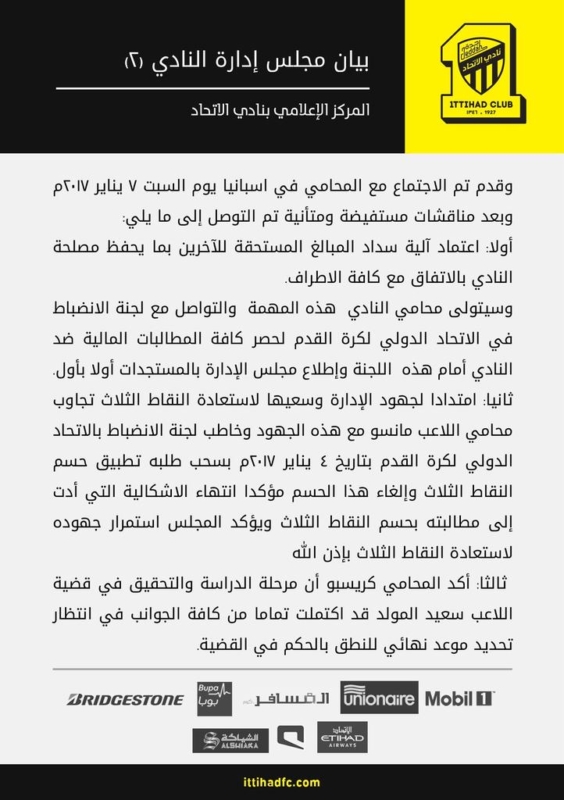 وذكرت أنها قامت -عبر رئيس النادي “حاتم باعشن”- بالاجتماع مع المحامي “خوان كريسبو”، في إسبانيا، من أجل الوقوف على مستجدّات قضية اللاعب مانسو التي تسبّبت في خصم 3 نقاط من رصيد الفريق بالدوري، كما أوضحت أنه تمّت العديد من المخاطبات لاستعادة النقاط الثلاث.