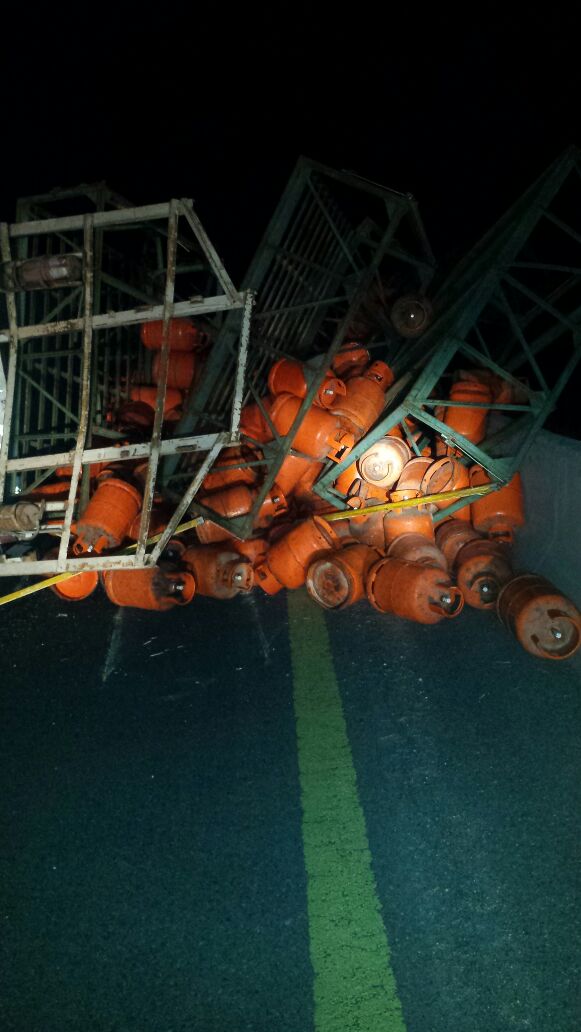 وأضاف: “أدى ذلك إلى سقوط كامل الحمولة على جانبي الطريق، وكذلك توقّف شاحنة أخرى خلفها تحمل العدد نفسه من الحمولة، وتساقط بعض من أسطوانات الغاز التي تحملها”.