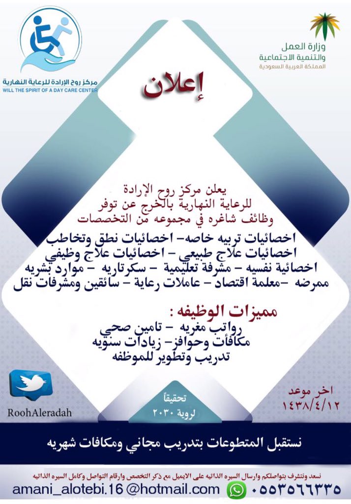 أعلن مركز روح الإرادة للرعاية النهارية بمحافظة الخرج عن توافر وظائف شاغرة للجنسين في مجموعة من التخصصات، وفق الوظائف والتخصصات التالية: