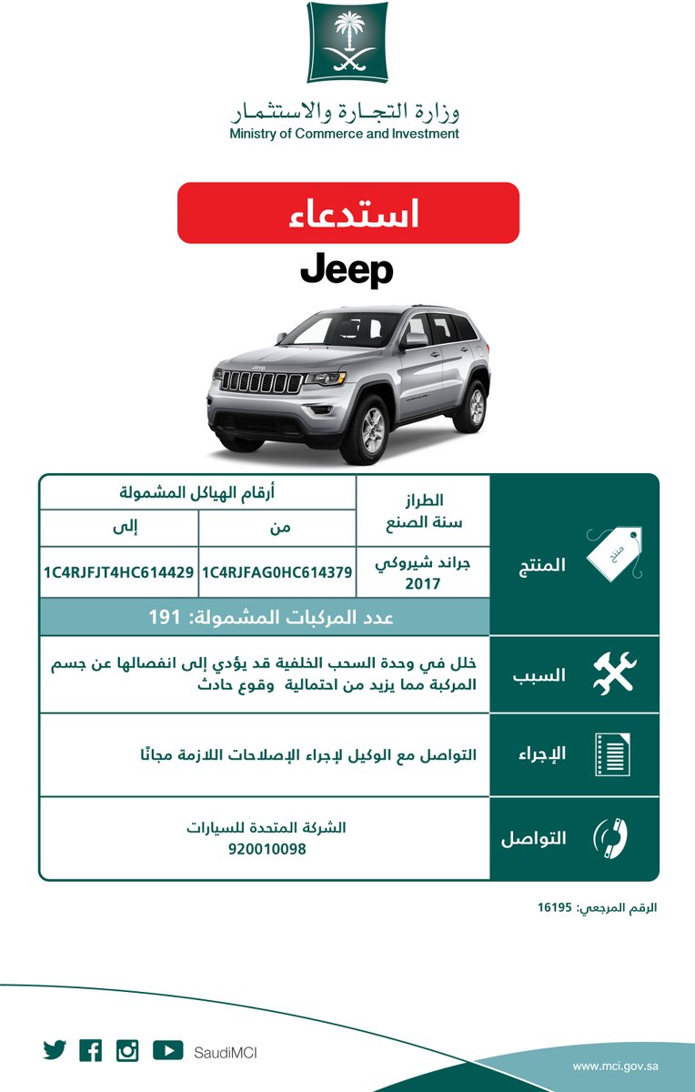 أعلنت وزارة التجارة والاستثمار عن استدعاء 191 مركبة “جيب – جراند شيروكي” (2017)، وذلك لوجود خلل في وحدة السحب الخلفية.