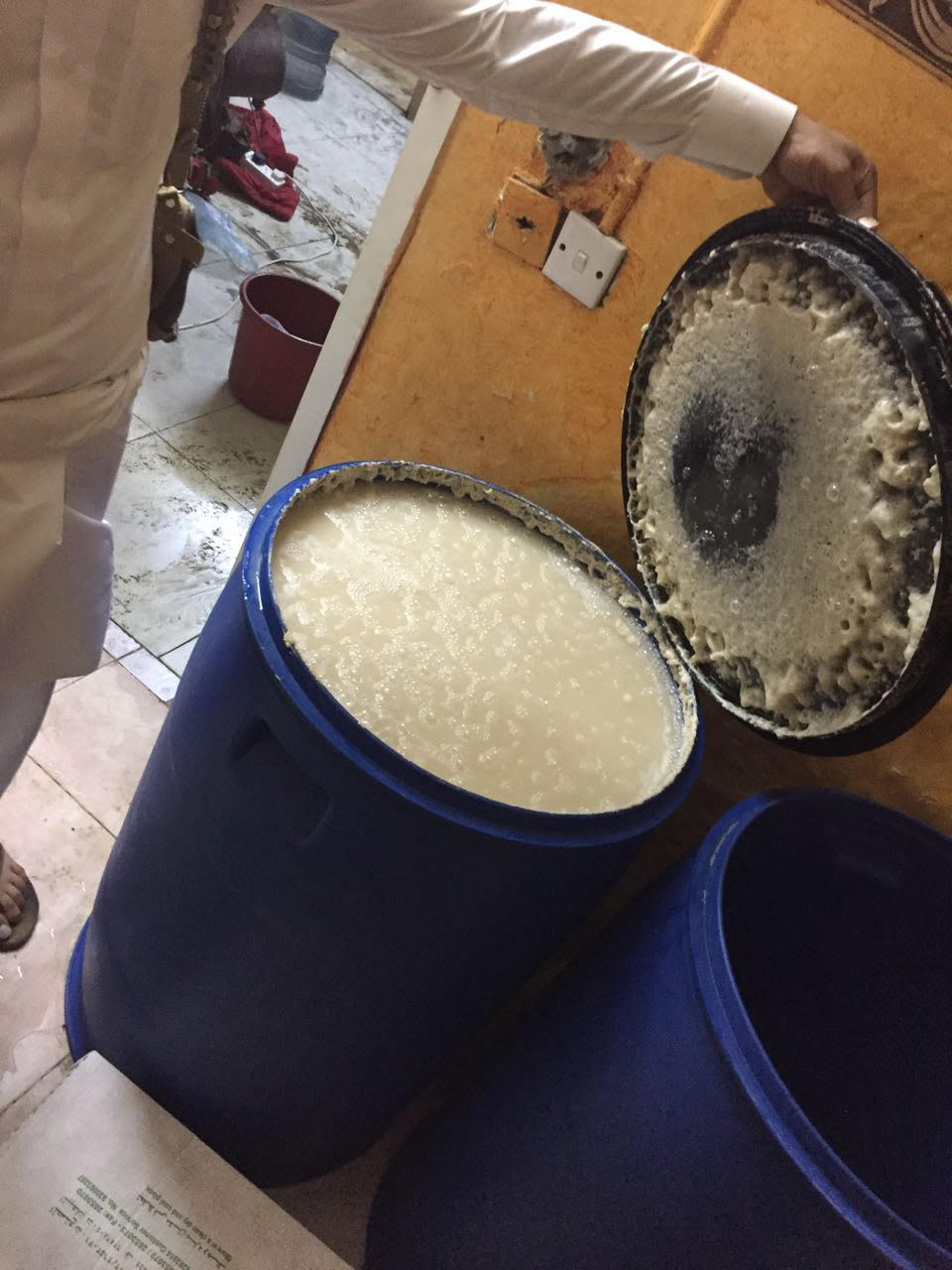 وعُثر بداخل المصنع على أدوات التصنيع، و345 كيس، و6 براميل (سعة 1000 لتر) مليئة بمادة العرق المسكر، فتم التحفّظ عليهم، وإحالتهم لجهة الاختصاص، وما زالت التحريات مستمرة.
