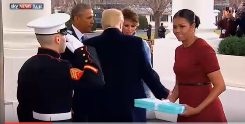 وقدمت زوجة ترامب صندوقاً أزرق إلى ميشال أوباما والتي بدت عليها علامات الارتباك حيث لم تجد مكاناً تضع فيه الهدية ما سبب لحظات من الحرج إلا أن تدخل أوباما أنقذ الموقف.