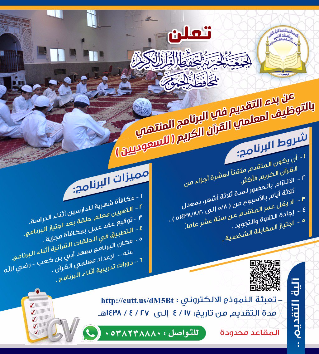 أعلنت الجمعية الخيرية لتحفيظ القرآن الكريم “تبيان”، بمحافظة الجموم، عن بدء التقديم في البرنامج المنتهي بالتوظيف لمعلّمي القرآن الكريم (للسعوديين)، وفق شروط البرنامج التالية: