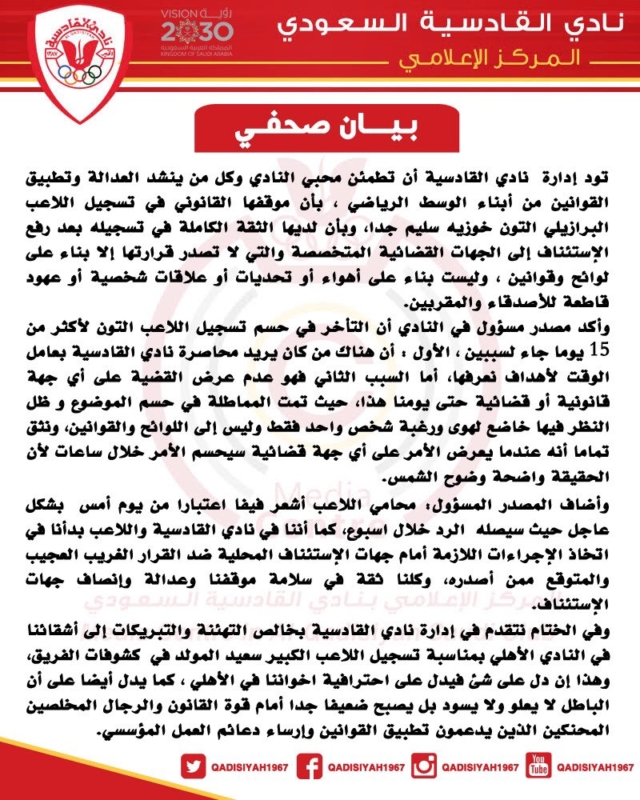 “تود إدارة نادي القادسية أن تطمئن محبي النادي، وكل من ينشد العدالة وتطبيق القوانين من أبناء الوسط الرياضي بأن موقفها القانوني في تسجيل اللاعب البرازيلي إلتون خوزيه سليم جدًا، وبأن لديها الثقة الكاملة في تسجيله بعد رفع الاستئناف إلى الجهات القضائية المختصة التي لا تصدر قراراتها إلّا بناءً على لوائح وقوانين، وليست بناءً على أهواء، أو تحديات، أو علاقات شخصية وعهود قاطعة للأصدقاء والمقربين.